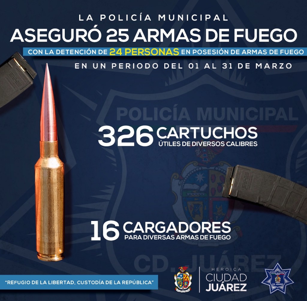 ASEGURAMIENTO. Pero regresemos a lo que la policía municipal logro asegurar durante el mes de marzo. Detuvo a 24 personas en posesión de 25 armas de fuego, asegurando 326 cartuchos de diversos calibres y 16 cargadores para diferentes armas de fuego. Todas estas personas fueron puestas a disposición del Agente del Ministerio Público Federal, adscritos a la Fiscalía General de la Republica.