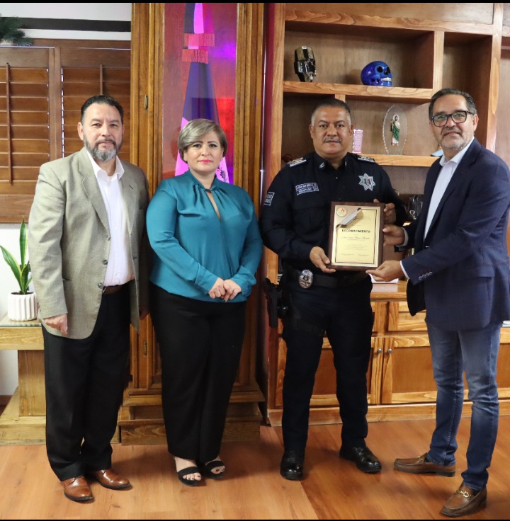 HONESTIDAD. El reconocimiento en placa dice lo siguiente: “Por su honestidad y valentía en el desempeño de su función por medio de la cual asegura la tranquilidad de la ciudadanía defendiendo con valentía y honor los derechos de los que conformamos esta ciudad”. El Presidente de la Asociación Religiosa José Luis Aguilar Cuellar en representación de todos sus asociados fue quien le hizo entrega de esta placa al Secretario César Omar Muñoz Morales haciendo extensiva dicha felicitación a todo el personal que conforma esta Secretaría de Seguridad Pública.