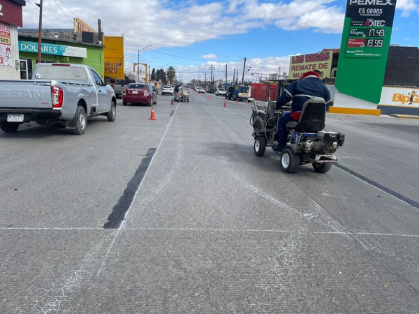 Ciudad Juárez – Personal del Departamento de Control de Tráfico de la Coordinación General de Seguridad Vial, pintaron las líneas para delimitar los carriles de circulación vehicular en la avenida Plutarco Elías Calles, en el tramo comprendido entre el bulevar Oscar Flores y Camino Viejo a San José.