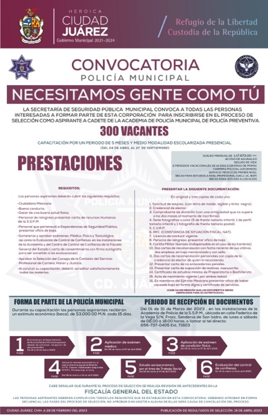 Así mismo, dijo que el periodo de recepción de documentos es del 01 al 31 de marzo del 2023, en las instalaciones de la Academia de Policía, ubicada en la calle Federico de la Vega, del fraccionamiento Senderos de San Isidro, en un horario de lunes a sábado de 08:00 a 18:00 horas o llamar al teléfono 656-7370405 ext. 71603.