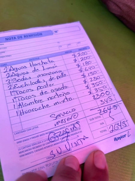 EJEMPLOS. He aquí algunos ejemplos del costo de estos alimentos que además de caros son antihigiénicos. Una agua de horchata cuesta 100 pesos, una agua de limón 100 pesos, una soda 60.00 pesos, una orden de enchiladas de pollo 320 pesos, unos tacos al pastor 150 pesos, unos tacos de carne asada 230 pesos, un alambre norteño 350 pesos, un huarache mixto 350 pesos y luego para acabarla de fregar le cobran por el servicio del mesero 345 pesos, como si hubiera usted comido en el mejor restaurante del mundo y no en un cuchitril como los que ahí se pusieron. Nos informan que un agua de las más pequeñas se la cobran en 30 pesitos. La defensa de estos sinvergüenzas es que ellos están pagando desde 90 mil pesos hasta 150 mil por los días que dure esta feria. Y todavía burlándose le ponen en su nota “gracias por su visita” en lugar de “gracias por dejarse robar”.