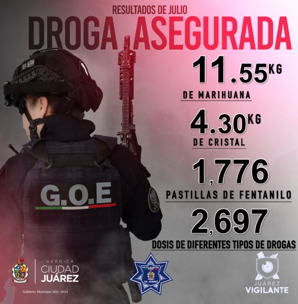 TRABAJO. Y cómo no reconocer el trabajo diario que realiza la Secretaría de Seguridad Pública Municipal a través de sus elementos policiacos si a diario logran la detención de varios individuos que cometen delitos de todo tipo, como son: violencia familiar, portación de armas de fuego, robo de vehículos, asaltos, homicidios, vendedores de drogas, aseguramiento de drogas, etc. Durante el mes de julio se aseguraron 2697 dosis de diferentes tipos de droga entre los cuales se encuentran 11.55 kilogramos de marihuana, 4.30 kilogramos de cristal, 1776 pastillas de fentanilo.