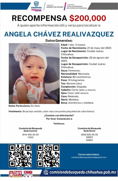 Ciudad Juárez.– La Fiscalía General del Estado ofrece una recompensa de 200 mil pesos a quien proporcione datos para la localización de Angela Chávez Realivázquez de un año de edad.