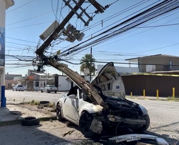 Ciudad Juárez.– Durante la madrugada del domingo, un vehículo Nissan deportivo, color blanco, con placas NRB9349 del estado de Texas, se impactó de lleno contra un poste de madera de la CFE.