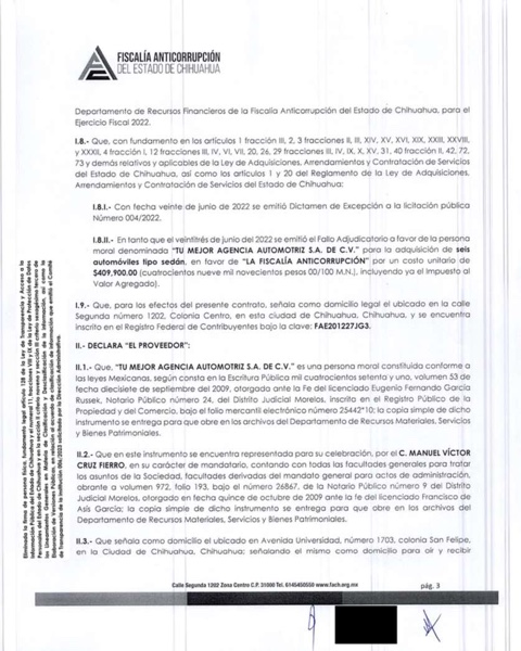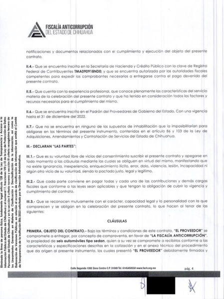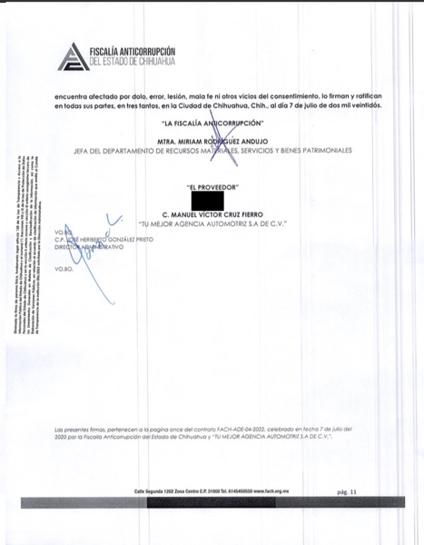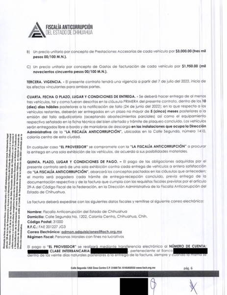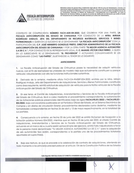 Ciudad Juárez.– Una investigación realizada por el medio digital de periodismo de investigación ZonaFree, revela que la Fiscalía Anticorrupción (vaya ironía) le otorgó un contrato a la empresa “Tú mejor agencia automotriz” propiedad de Víctor Manuel Cruz Russek, novio de la gobernadora Maru Campos Galván, por la compra de seis vehículos con un valor de 2 millones 489 mil 100 pesos.