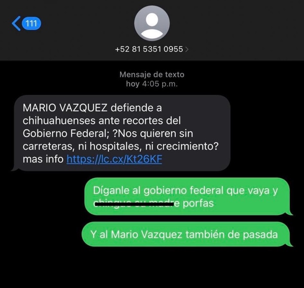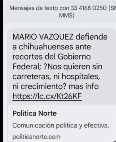 CONTRATOS. Mediante mensajes de texto telefónicos masivos que ha estado enviando a través de los teléfonos celulares en donde, según él, defiende a los chihuahuenses del gobierno federal por haber realizado recortes presupuestales que afecta a la creación de carreteras, hospitales y crecimiento en general. Indiscutiblemente Mario Vázquez Robles está enfocado en su campaña política para candidato a Senador a costa de lo que sea, olvidando por completo las obras en nuestra ciudad y que desde hace tiempo permanecen sin ningún avance, como lo es la terminación de la infraestructura del BRT 1 y BRT 2 que a cada rato son emplazadas.