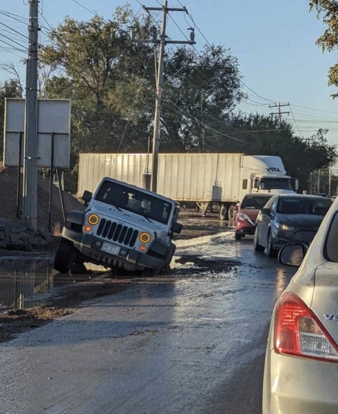 Ciudad Juárez.– La calle Camino Ortiz Rubio, a metros de la avenida Ejército Nacional, la cual fue repavimentada, por enésima vez fue abierta por la Junta Municipal de Agua y Saneamiento y cómo no colocaron señalamientos, además de dejar una fuga de agua, un vehículo todo terreno de la marca Jeep Wrangler cayó en una zanja y tuvieron que ayudar para sacarlo.