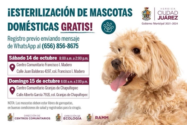 El día de mañana 15 de octubre, seguirá la esterilización de mascotas en el centro comunitario Granjas de Chapultepec, ubicado en la calle Alberto García 7918 de la colonia Granjas de Chapultepec. Los interesados deberán cerciorarse de que sus perros y gatos estén libres de garrapatas y en buenas condiciones de salud, además de que previamente tienen que registrarlos al número de teléfono 656-856-8675.
