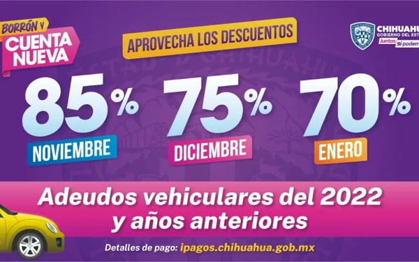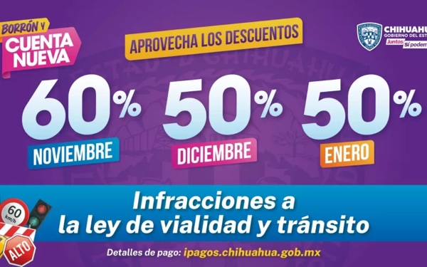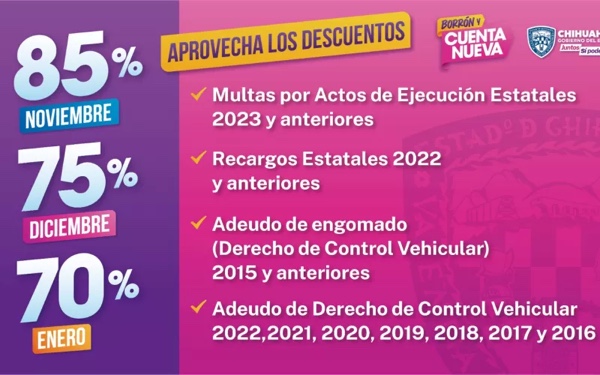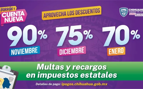 Chihuahua.- Esta mañana se anunció el descuento del 50 hasta el 90 por ciento en multas o recargos en diferentes trámites estatales, empezando este mes de noviembre hasta enero de 2024, con el programa “Borrón y Cuenta Nueva”.