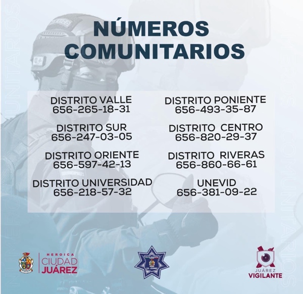Cualquier incidente que los juarenses tengan, marcar al número de emergencias 911 y los teléfonos comunitarios de los diversos distritos policiales.