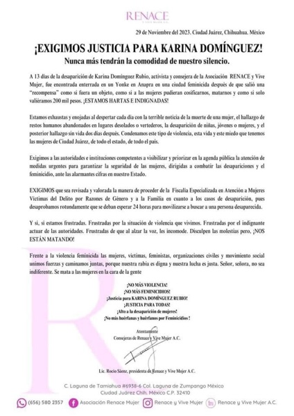 En un comunicado a través de sus redes sociales mencionaron que “estamos exhaustas y enojadas al despertar cada día con la terrible noticia de la muerte de una mujer, el hallazgo de restos humanos abandonados en lugares desolados o vertederos, la desaparición de niñas, jóvenes o mujeres. Condenamos este tipo de violencia, esta vida y este miedo que tenemos las mujeres de Ciudad Juárez, de todo el estado, de todo el país”.