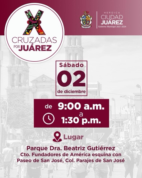 Ciudad Juárez.- El próximo dos de diciembre, de 9:00 a.m. a 1:30 p.m., se llevará a cabo la Cruzada por Juárez en la colonia Parajes de San José, esto en el parque lineal “Dra. Beatriz Gutiérrez” ubicado en las calles Fundadores de América y Paseo de San José.