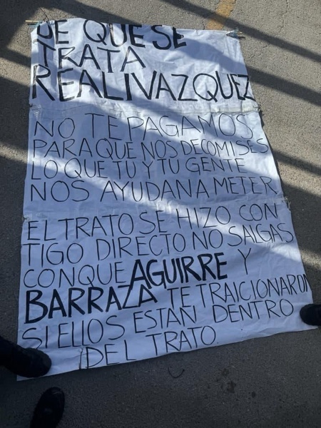 la lona fue colocada en el puente de bulevar Independencia y avenida De las Torres, donde acusa a Realivázquez de supuestos arreglos con un grupo criminal para ingresar armas al Cereso.