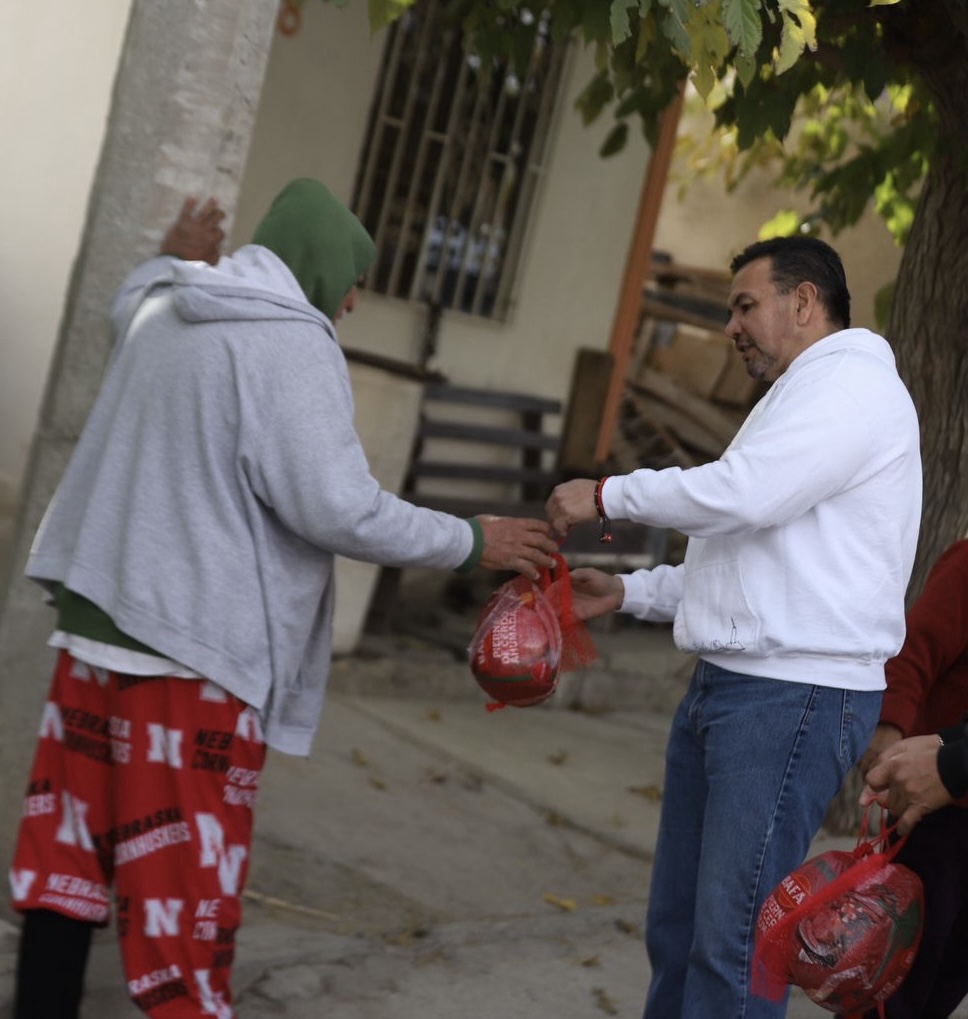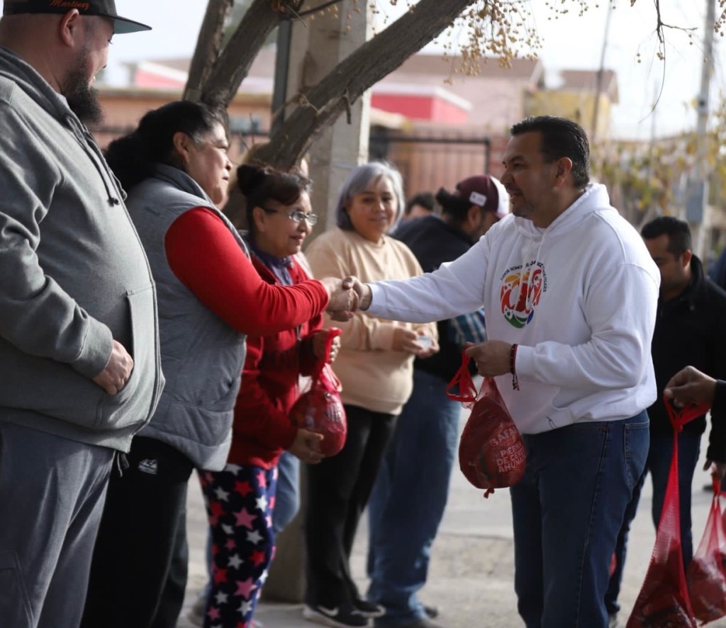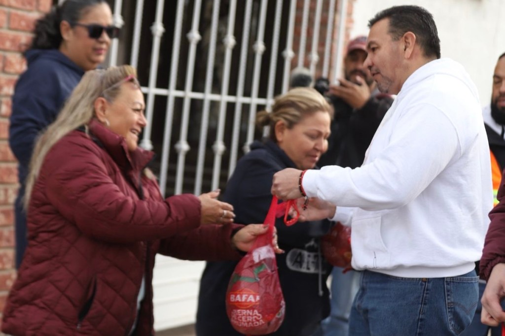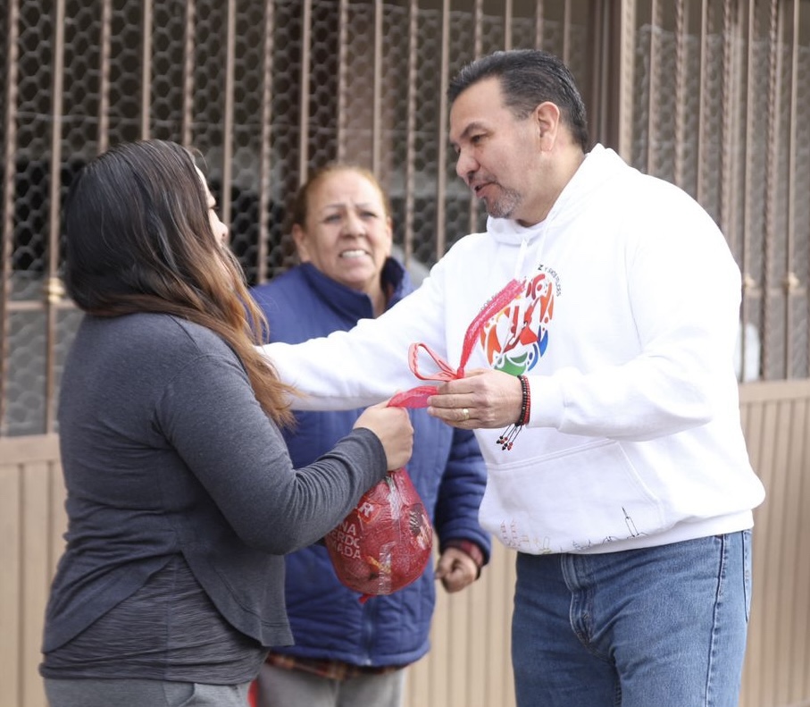 En la colonia Morelos I se entregaron mil piernas de puerco a las familias juarenses de manos del alcalde Cruz Pérez Cuéllar, quien recorrió casa por casa para hacer entrega de la pierna y aprovechar para desearles una feliz navidad a los beneficiarios.