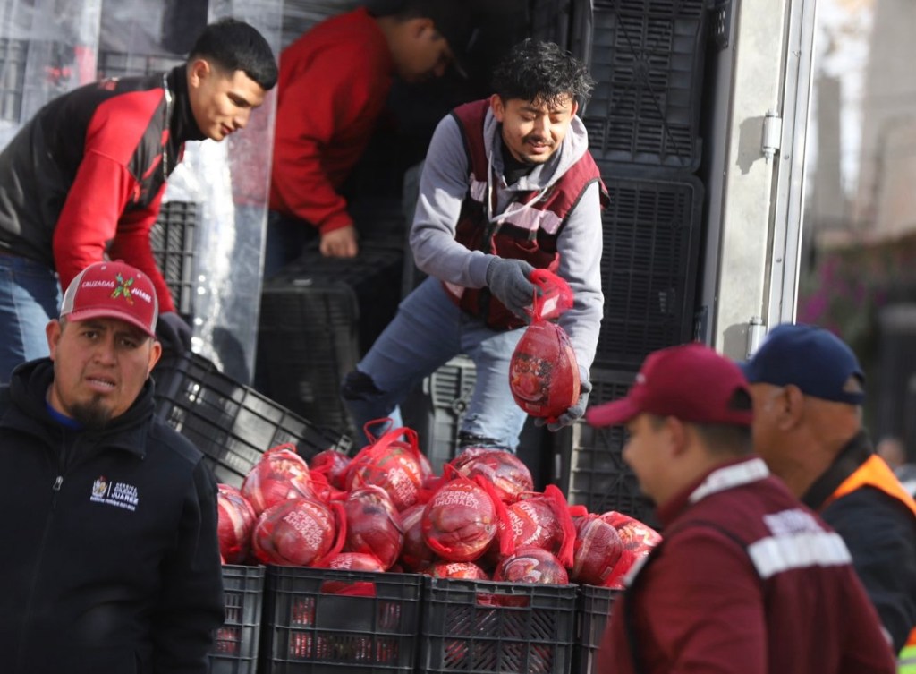 Ciudad Juárez.– Este día se rompió con el tradicional reparto de pollos que las anteriores administraciones municipales llevaban a cabo. Ahora las familias fueron beneficiadas con una pierna de puerco para estas próximas fiestas navideñas.