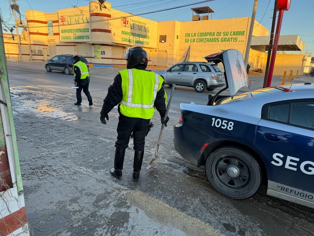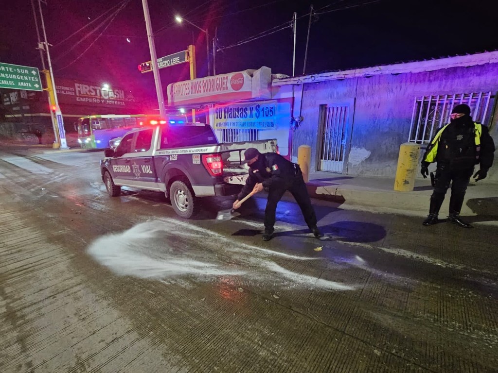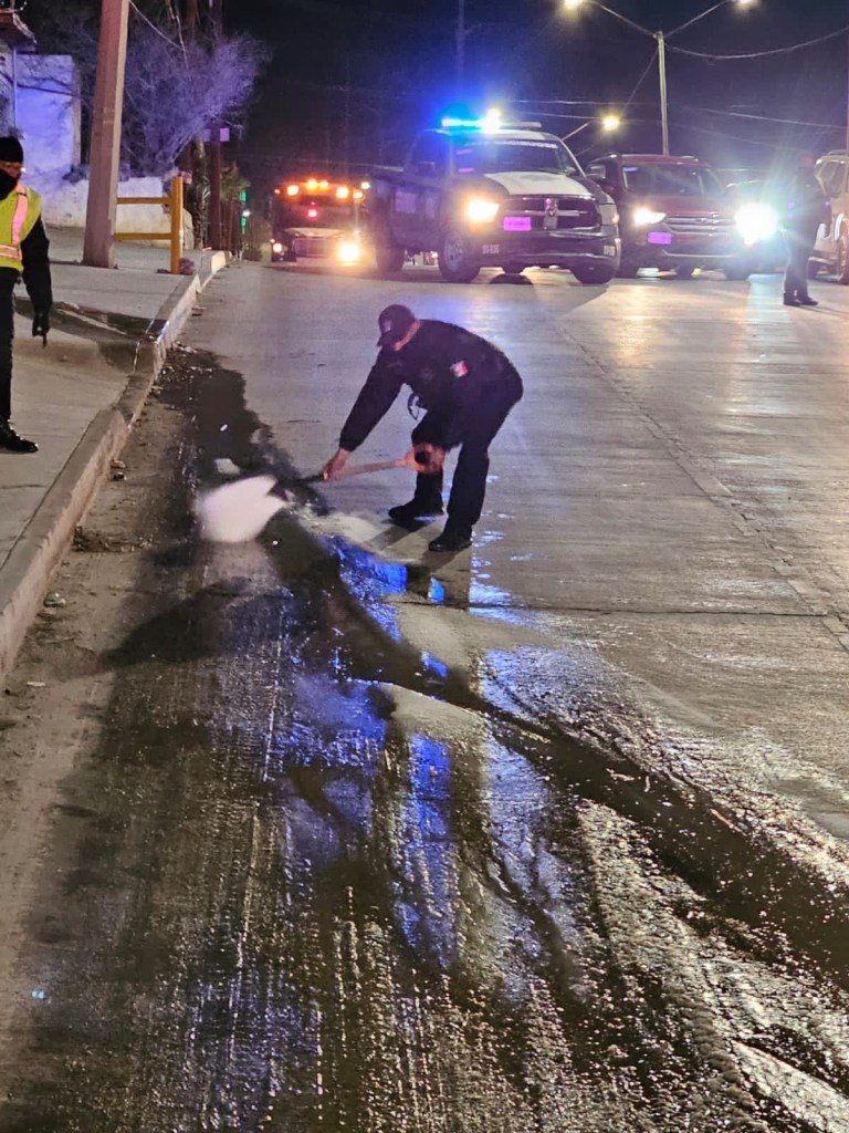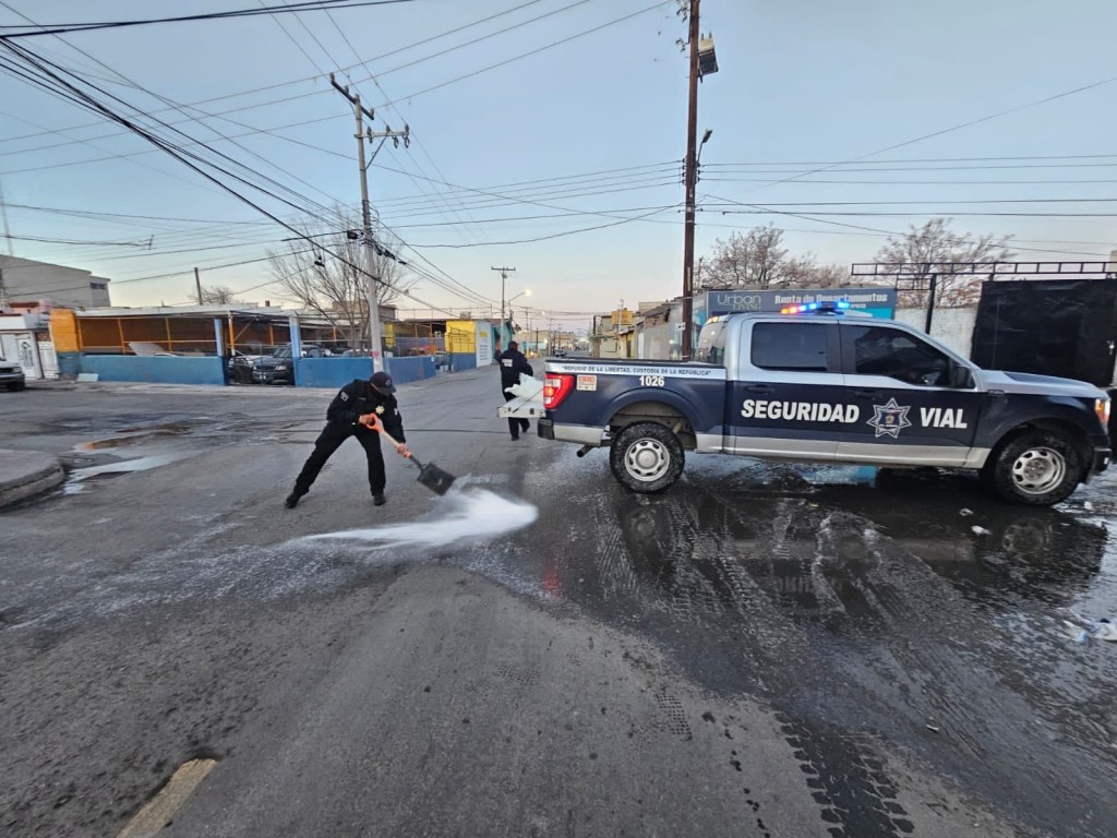Hasta ahorita agentes viales han aplicado sal y arena en diferentes avenidas para que los automóviles no sufran un percance al momento de circular, por lo que se pide moderar la velocidad.