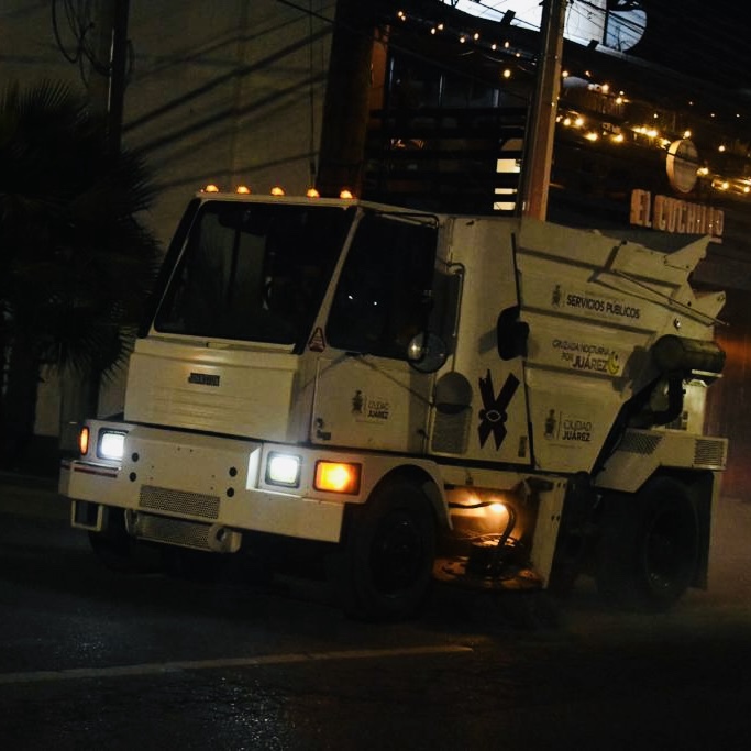 Ciudad Juárez.– Las barredoras no paran y menos durante las noches, las cuales circulan por avenidas para recoger la basura que se acumula en las orillas como la tierra de arrastre.