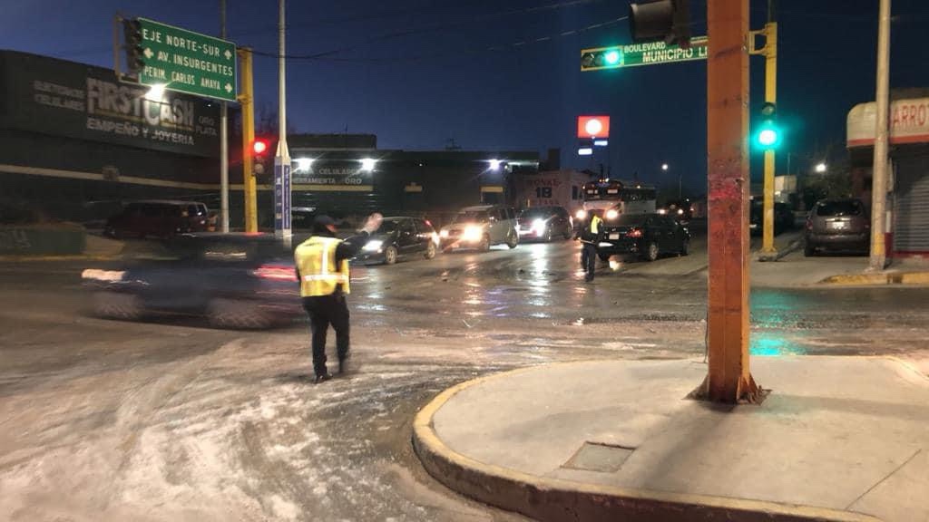 Ciudad Juárez.– A consecuencia de las bajas temperaturas que se han registrado en estos días en nuestra ciudad, se han cristalizado cientos de calles y varias avenidas que han provocado varios accidentes viales, a consecuencia también de la falta de pericia de los conductores.