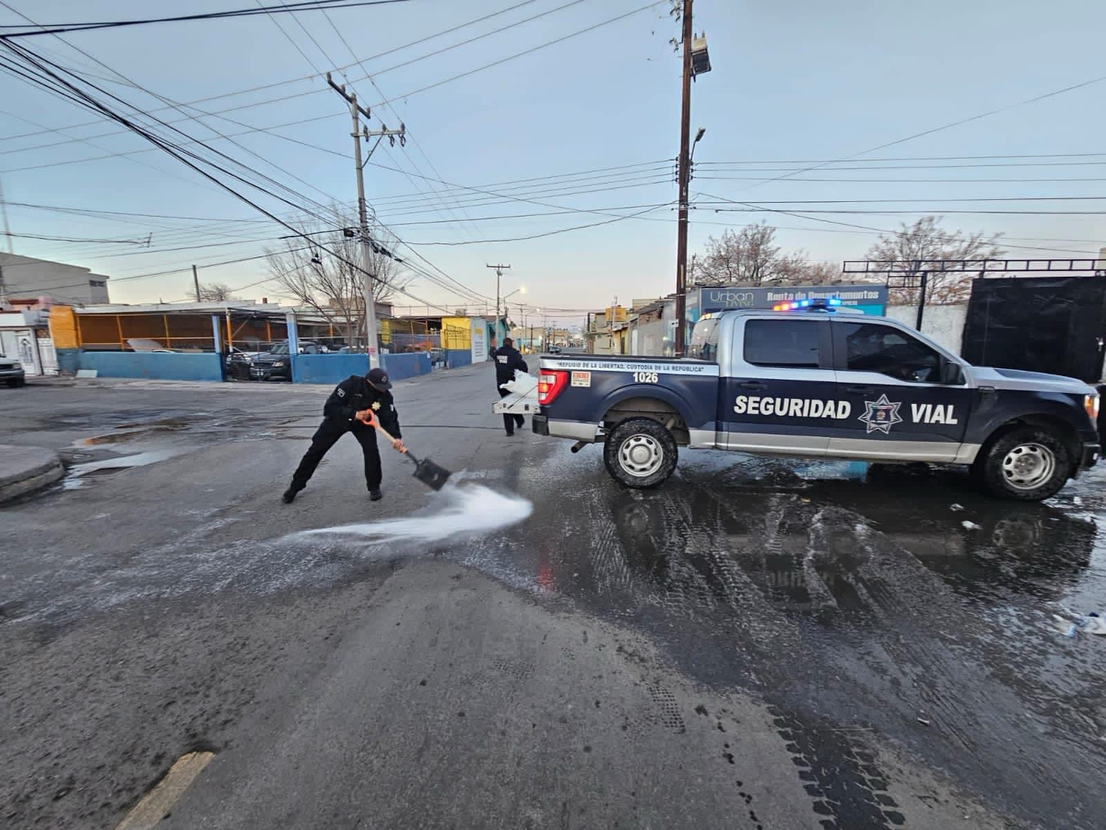 Hasta ahorita los únicos que han realizado labores para evitar accidentes en las calles cristalizadas son los agentes viales de la Coordinación General de Seguridad Vial que con sal y arena han esparcido sobre las avenidas para evitar el derrape de vehículos.