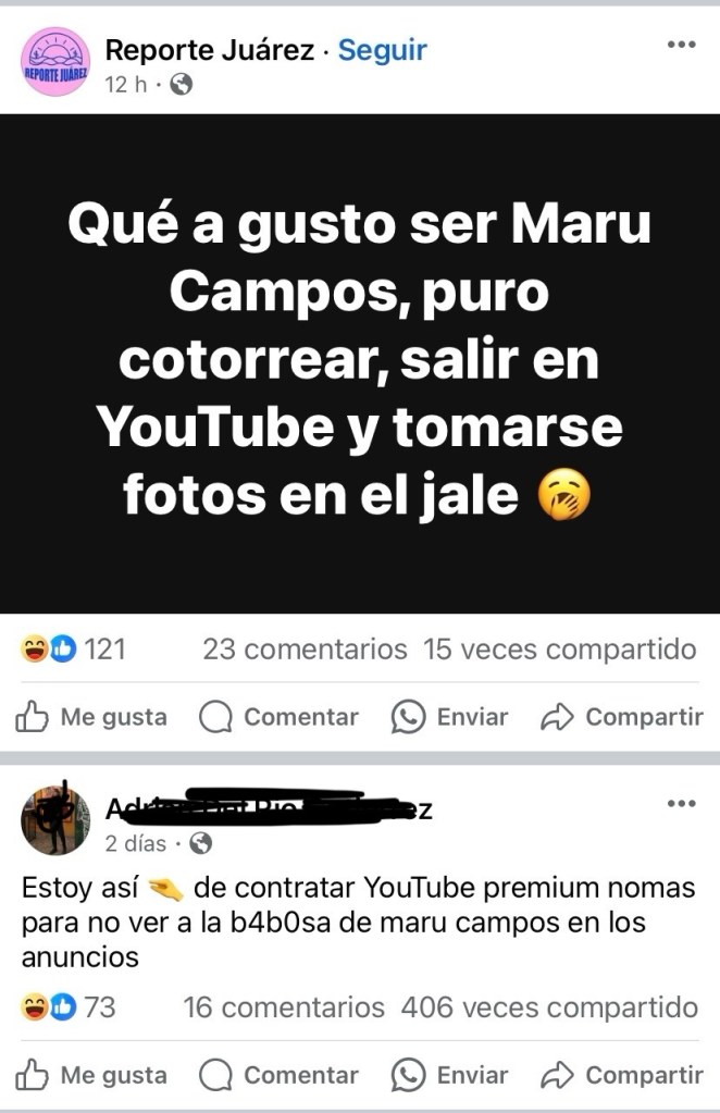 Chihuahua.- En redes sociales se han viralizado las constantes pautas publicitarias de la gobernadora Maru Campos en YouTube y otros medios digitales, los cuales exigen se haga público el gasto que se realizó y si fue directamente pagos realizados por el gobierno estatal o por medio de terceros que se prestan para inflar los números para dar paso a los moches en el gasto por publicidad.