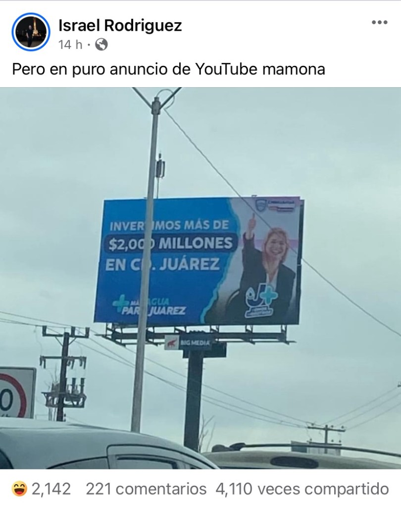 Ha sido objetos de burlas el hecho de que haya hasta espectaculares por toda la ciudad donde la gobernadora presume que en Juárez se invirtieron 2 mil millones de pesos, sumamente criticado ya que no se ven por ningún lado y hacen mofa de que esa inversión únicamente ha sido para promocionar su imagen ante el evidente nulo trabajo que no se ha realizado en Juárez ni en el estado que ninguna obra se ha terminado.