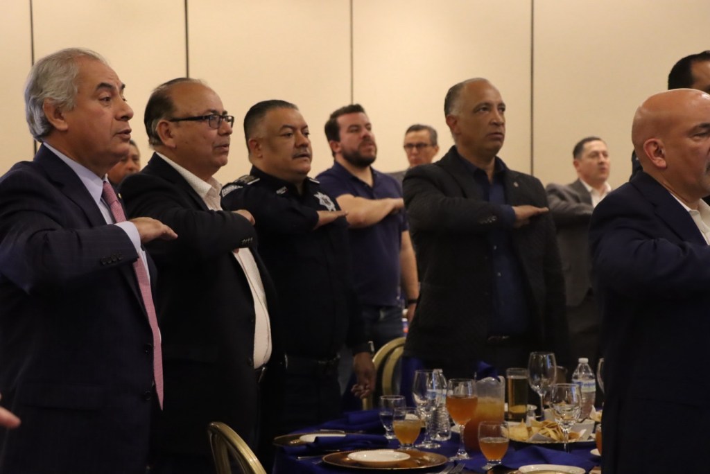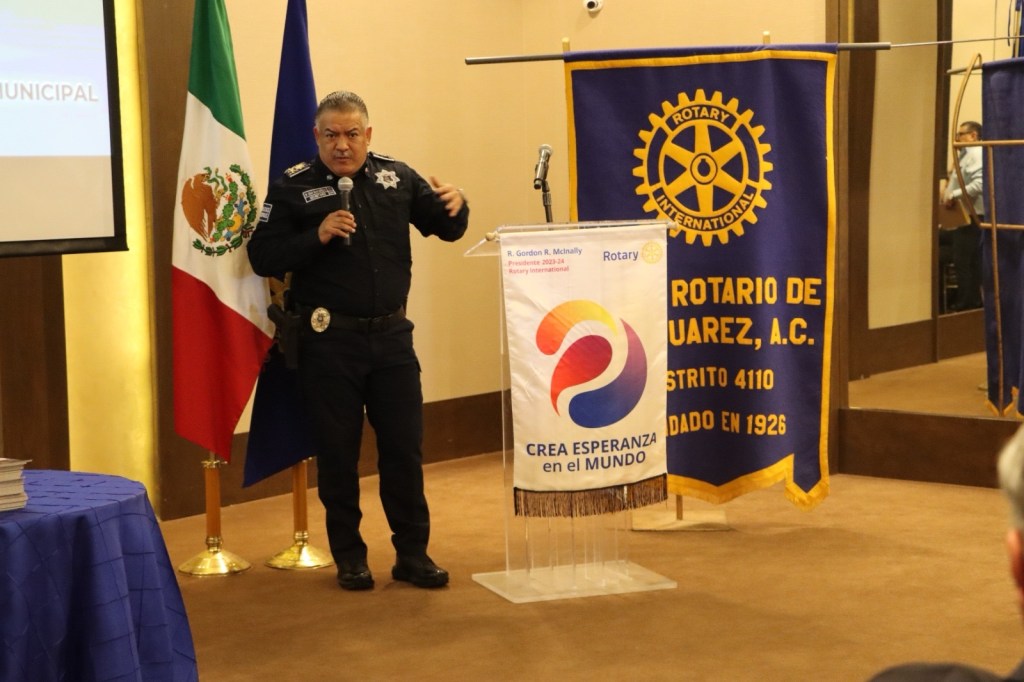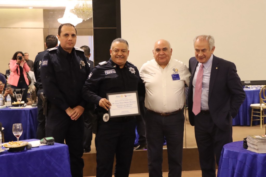 Ciudad Juárez.- Integrantes del Club Rotario Ciudad Juárez Oriente, reconoció este día la labor que la realizado la policía municipal y al secretario, César Omar Muñoz Morales, por su labor y entrega a la seguridad de los juarenses.