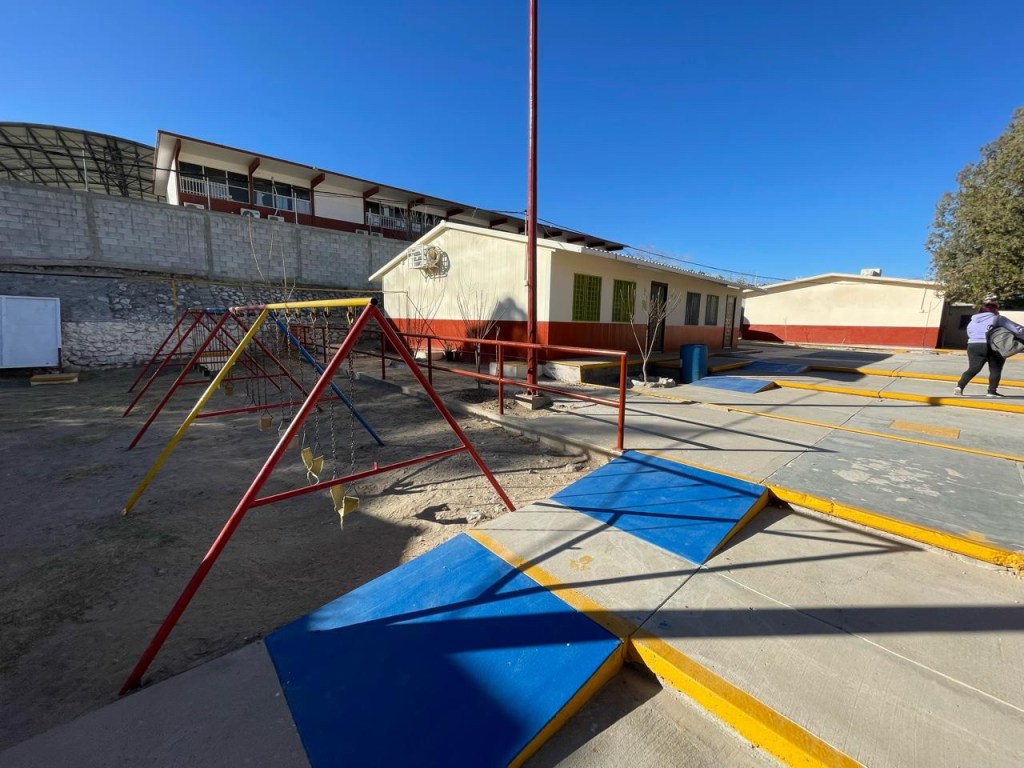 Ciudad Juárez.– Con una inversión de 986 mil pesos, el Jardín de Niños “Agustín Melgar” fue beneficiado con trabajos de resane y pintura, instalación de malla sombra en la explanada, suministro e instalación de juegos infantiles, demolición en sanitarios, así como la rehabilitación de la sala de juntas y baños de directivos.