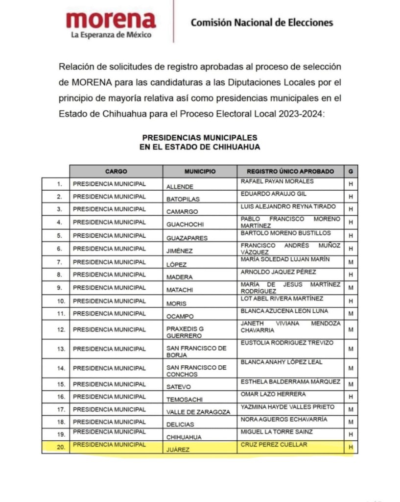 Ciudad Juárez.- El partido del Movimiento de Regeneración Nacional (Morena) dio a conocer las 67 candidaturas por las alcaldías en el estado de Chihuahua, entre ellas la del alcalde Cruz Pérez Cuéllar que de nueva cuenta será el abanderado también de la alianza existente con el PT y el PVEM.