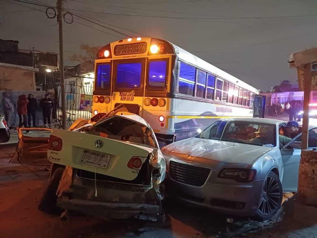 Un camión de transporte de personal que brinda servicio a la maquiladora Resideo, se averió en plena subida en las calles Emilio Campa y Olivo de la colonia Chihuahua, y se fue de frente y para colmo no le funcionaron los frenos, prensando, junto con otro camión de transporte, a un vehículo de la marca Volkswagen Jetta en que venían cinco personas, tres de ellos menores de edad.