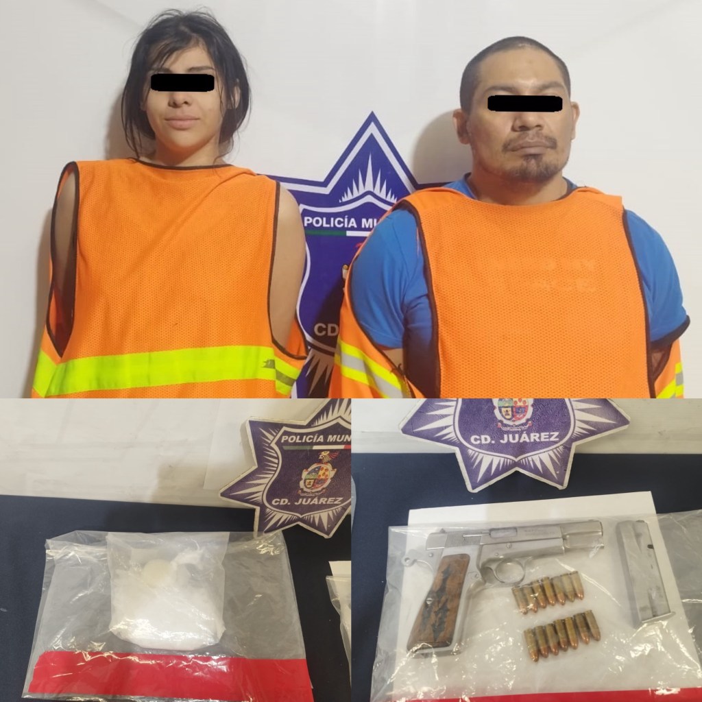 Ciudad Juárez.– Elementos de la policía municipal detuvieron a una pareja Humberto L. P. de 40 años y Griselda C. C. de 26 años, por los delitos de Allanamiento, contra la ley federal de armas de fuego y explosiva y delitos contra la salud, esto en la colonia Hidalgo.
