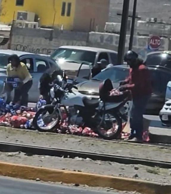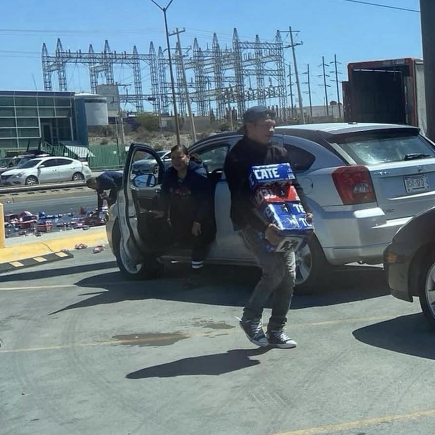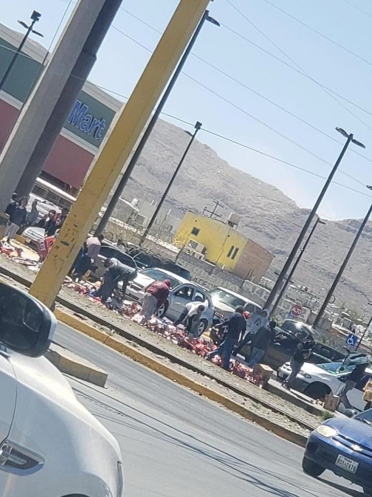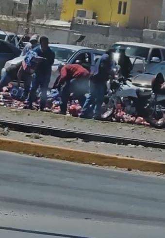 Ciudad Juárez.– Un camión de la empresa Cervecería Moctezuma, tiró en la vía pública toda la mercancía de producto de cerveza, por lo que la rapiña no se hizo esperar.