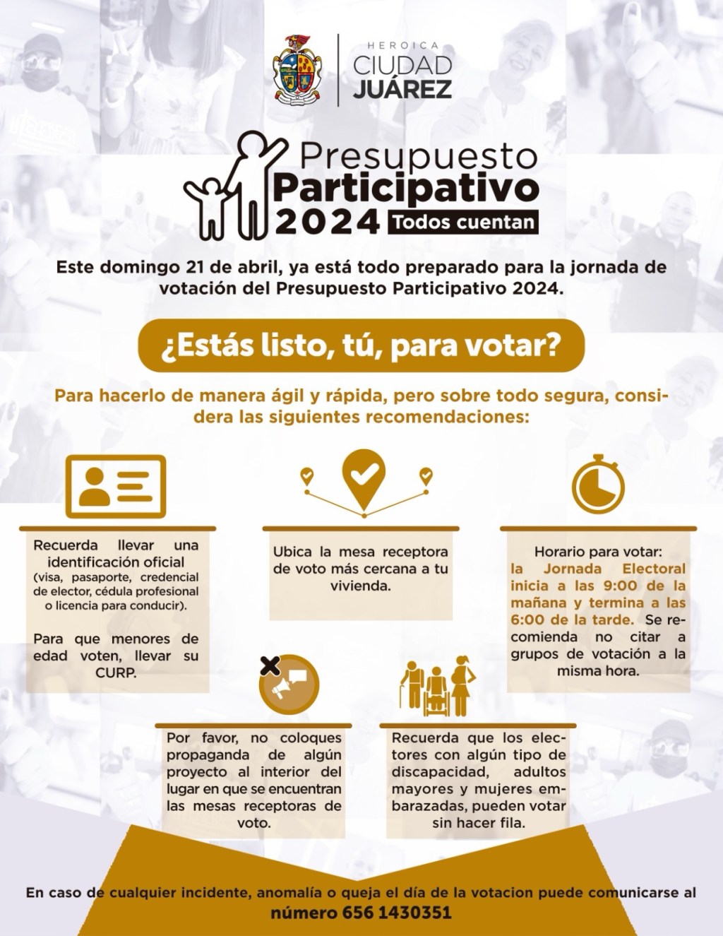 Ciudad Juárez.- El día domingo 21 de abril se llevará a cabo la votación para los diferentes proyectos que los juarenses solicitaron a través de Presupuesto Participativo 2024.