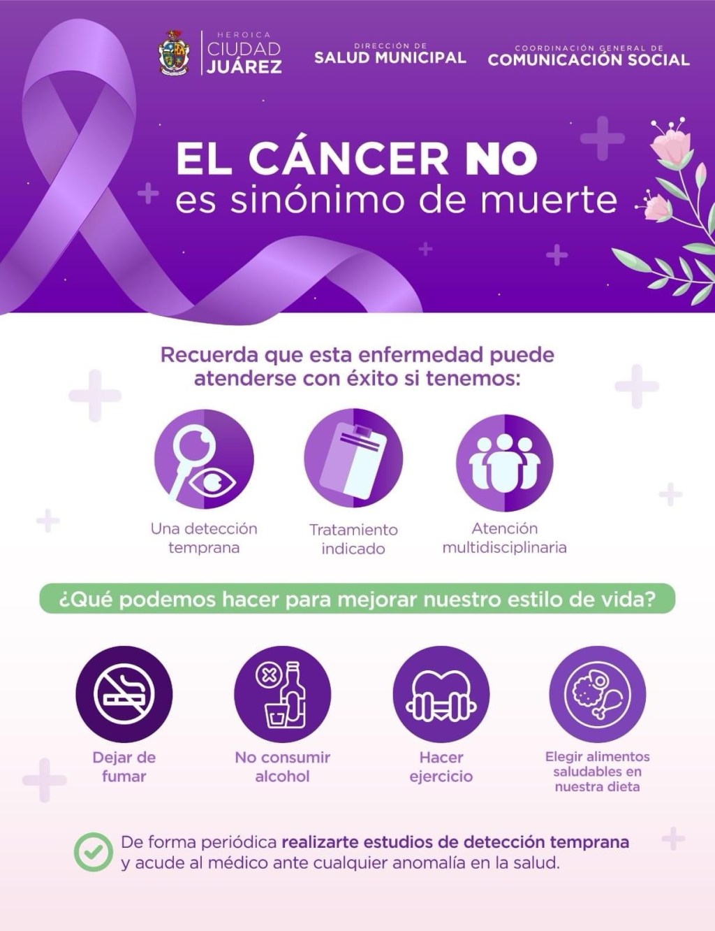 Ciudad Juárez.- Con motivo del mes de la prevención y control de cáncer en el mundo, se recomienda tener hábitos saludables y revisiones periódicas de la salud para detectar oportunamente esta enfermedad.