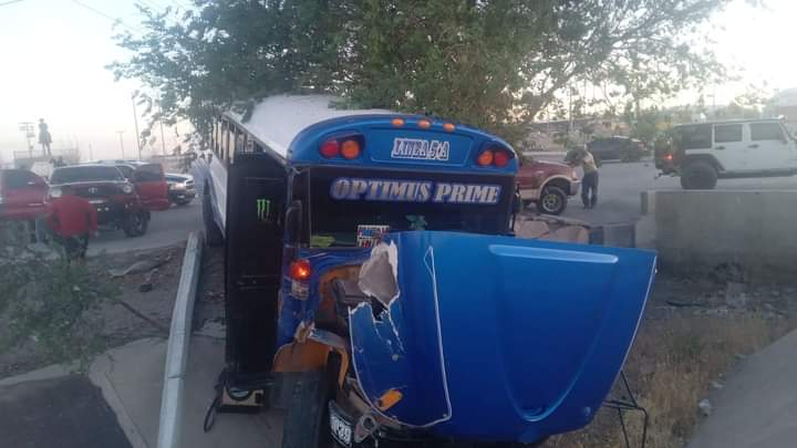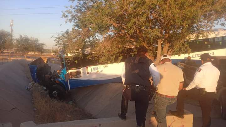 Ciudad Juárez.-Esta tarde, un autobús de la Línea 5A terminó severamente dañado en un canal de irrigación, situado junto al Eje Vial Juan Gabriel y la carretera a Casas Grandes.