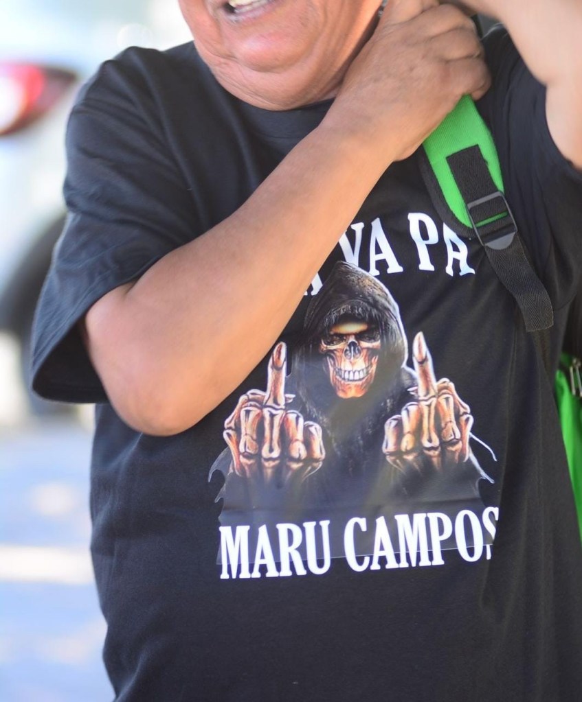 La playera en color negra, con la imagen de la muerte haciendo una seña obscena, se aprecia a leer “ESTA VA PA’ MARU CAMPOS”.