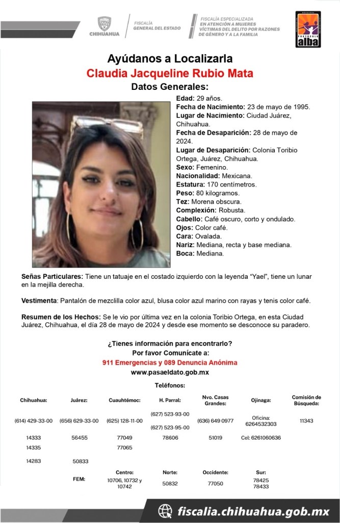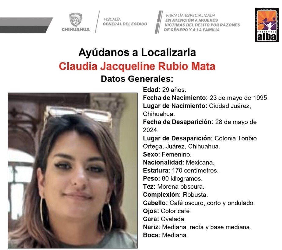 Ciudad Juárez.– La familia de la joven de nombre Claudia Jacqueline Rubio Mata, se encuentra desesperada por saber sobre su paradero ya que desde el día de ayer no ha regresado a casa.