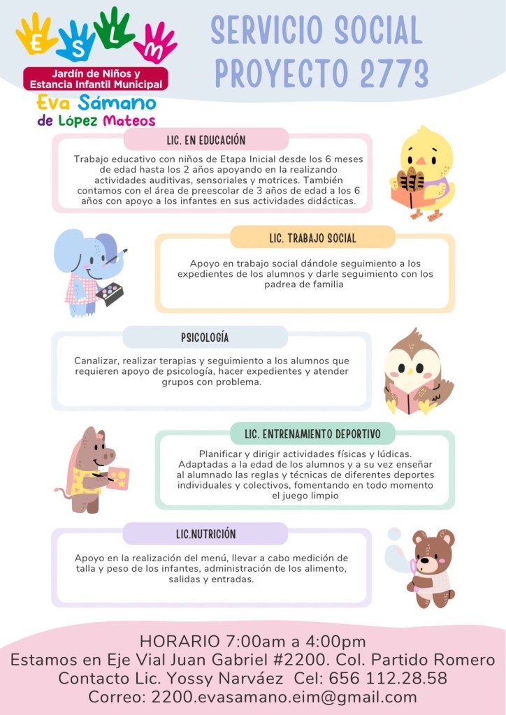 La Estancia y Jardín de Niños tiene un convenio con la UACJ para que los estudiantes de carreras afines a la educación puedan realizar en dicho lugar su servicio social y con ello enfocar sus conocimientos y prácticas con las niñas y niños del lugar.