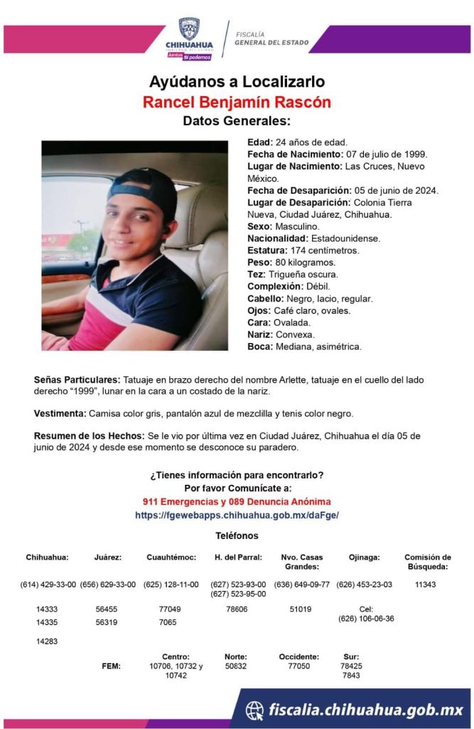 Ciudad Juárez.-Familiares y amigos de Benjamin Rancel Rascón, de apenas 24 años, están pidiendo ayuda a los juarenses para localizar al joven.