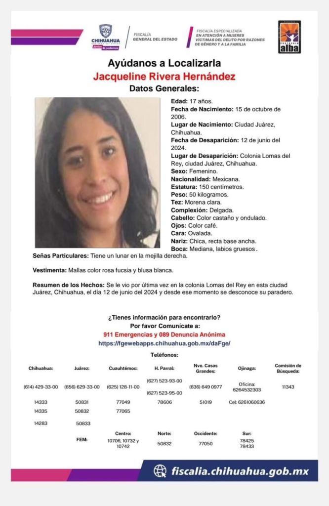 Ciudad Juárez.-Jaquelíne Rivera Hernández, de apenas 17 años, está desaparecida desde ayer; sus familiares imploran apoyo para localizarla.