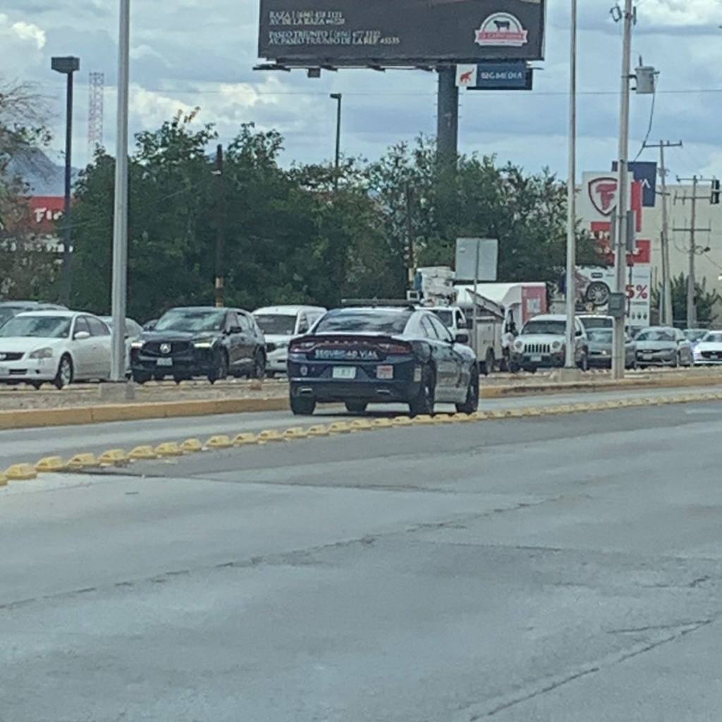 Sin torretas encendidas ni sirenas, frente a Galerías Tec, sobre la avenida Tecnológico para evadir el tráfico, más adelante pasando la avenida Pedro Rosales de León se cambio de carril, se pasó un semáforo y siguió su camino.
