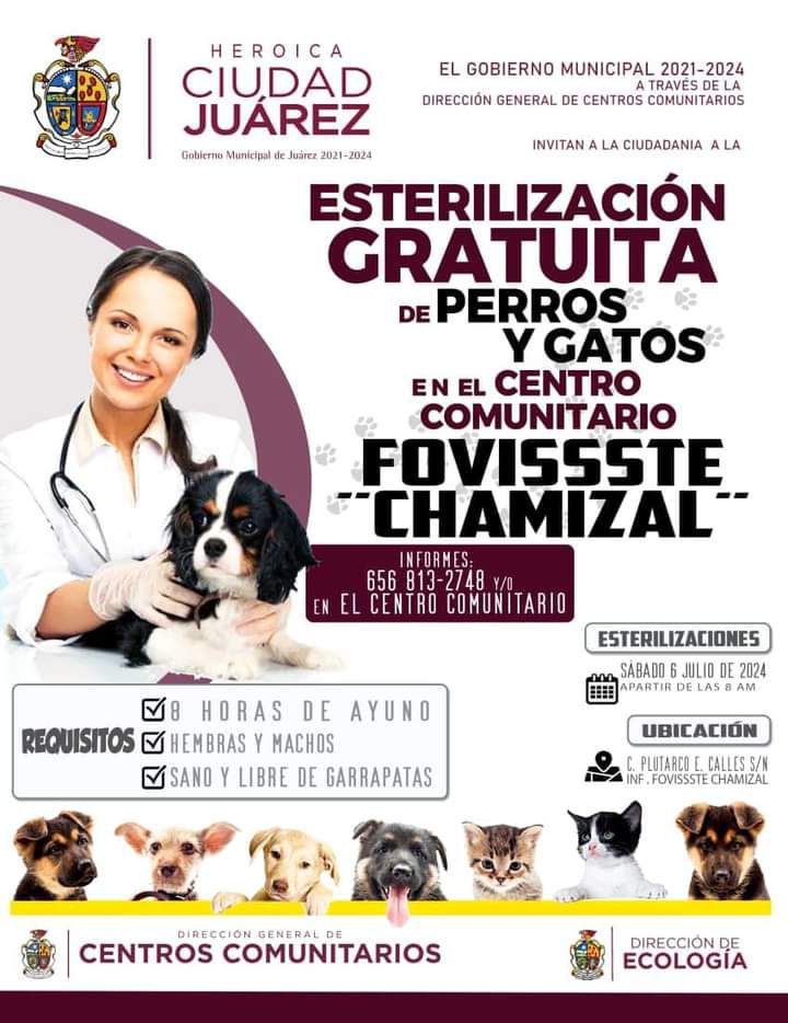 Ciudad Juárez.-Preparen a sus mascotas para este próximo sábado 6 de julio, pues habrá esterilizaciónes gratuitas para perros y gatos, en la colonia Fovissste Chamizal.