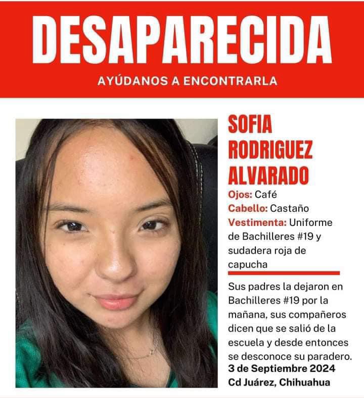 Ciudad Juárez.– Una familia angustiada pide el apoyo de los Juarenses para poder localizar a Sofía Rodríguez Alvarado de 15 años, quien salió del Bachilleres #19 está mañana y no ha regresado a casa.