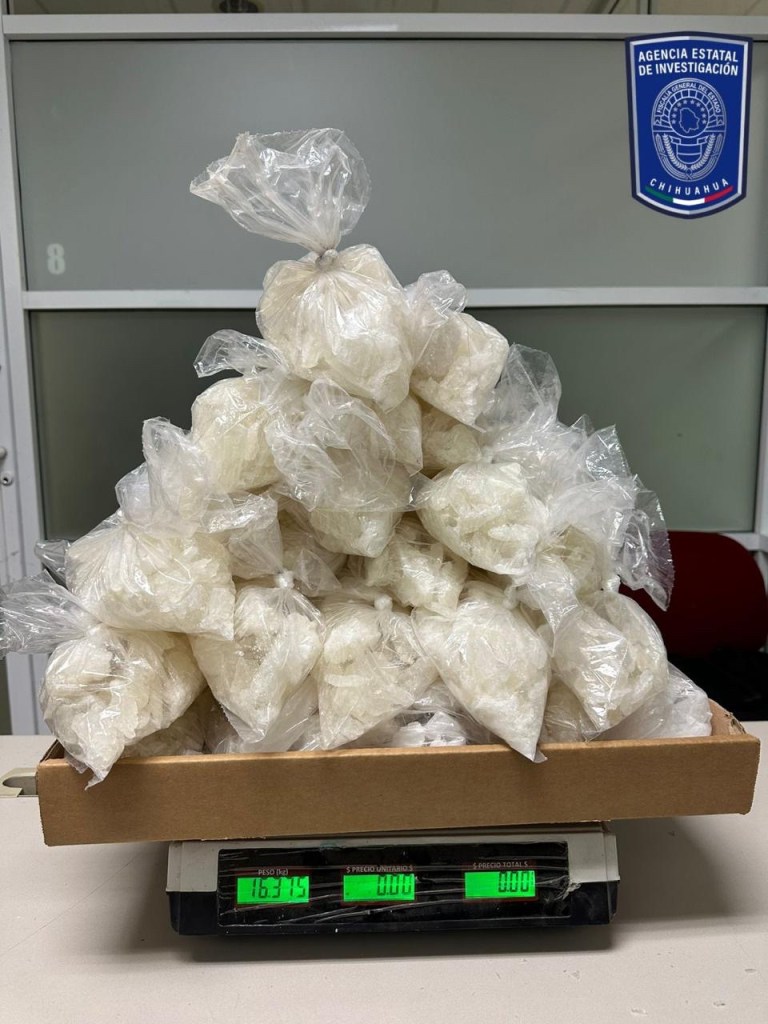 Ciudad Juárez.- Elementos de la Agencia Estatal de Investigaciones de la Fiscalía General del Estado de Chihuahua detuvo a una pareja con más de 16 kilogramos de metanfetamina, conocida como cristal, en un operativo realizado en el kilómetro 345 de la carretera Ahumada-Juárez. Los detenidos son Gilberto T. G., de 30 años, y Perla Fabiola M. F., de 19 años.