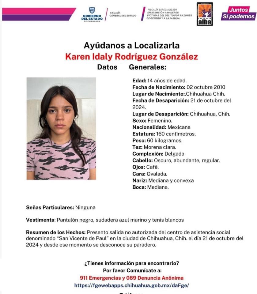 La última vez que se les vio a ambas fue al salir de manera no autorizada del centro de asistencia social denominado “San Vicente de Paul” en la ciudad de Chihuahua y desde ese momento se desconoce su paradero pero se cree que puedan encontrarse en la ciudad.