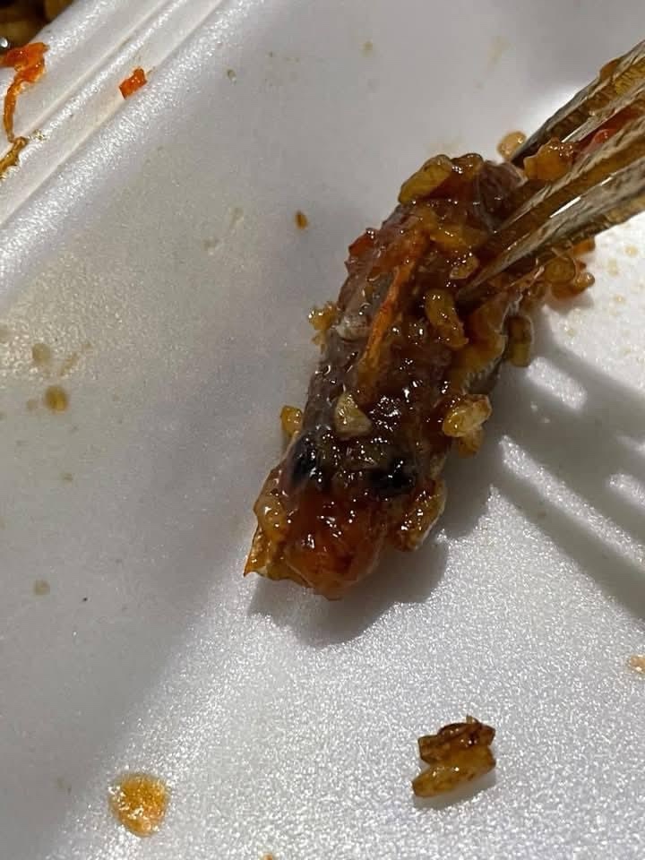 DESAPROVÉCHALA, fui ayer con una amiga pedimos pollo agridulce y pollo picante con arroz. Cuando lo recalentamos encontramos esto, no es ni un camarón ni una cabeza de pollo ES UNA RATA.”
