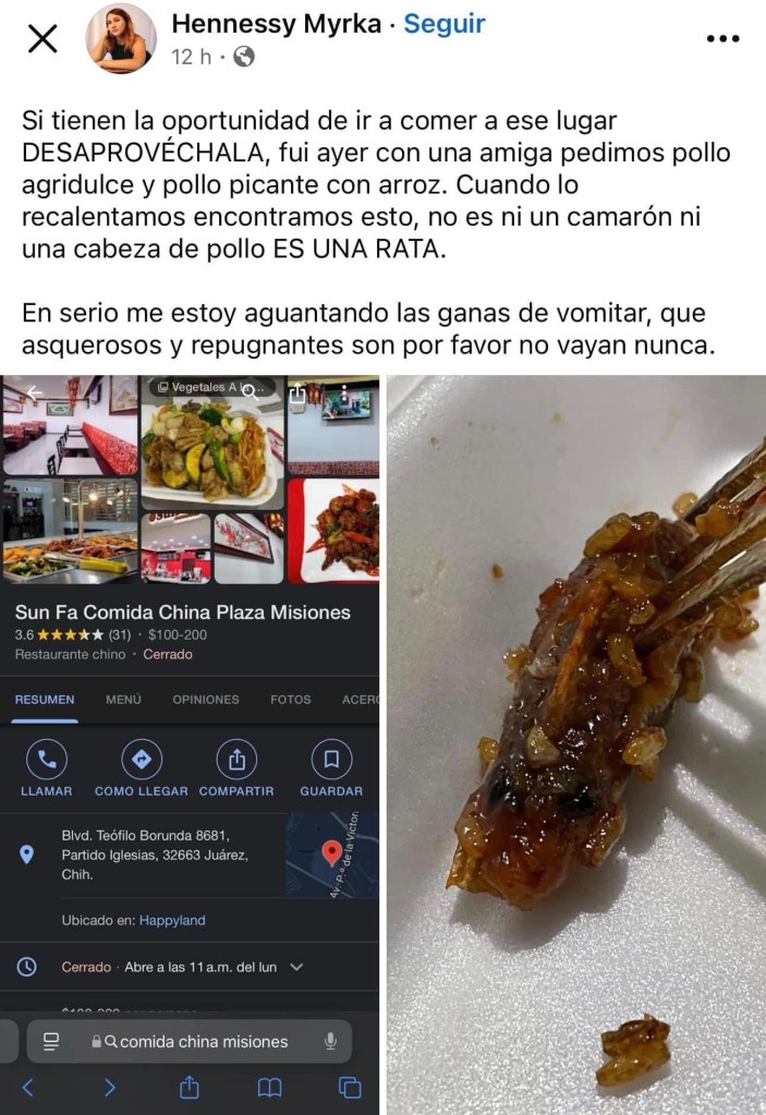 Ciudad Juárez.– Una usuaria denunció que al haber comprado un platillo en el local de comida china de nombre Sun Fa, en la plaza de comidas del centro comercial Las Misiones, le salió lo que parece una cabeza de ratón.