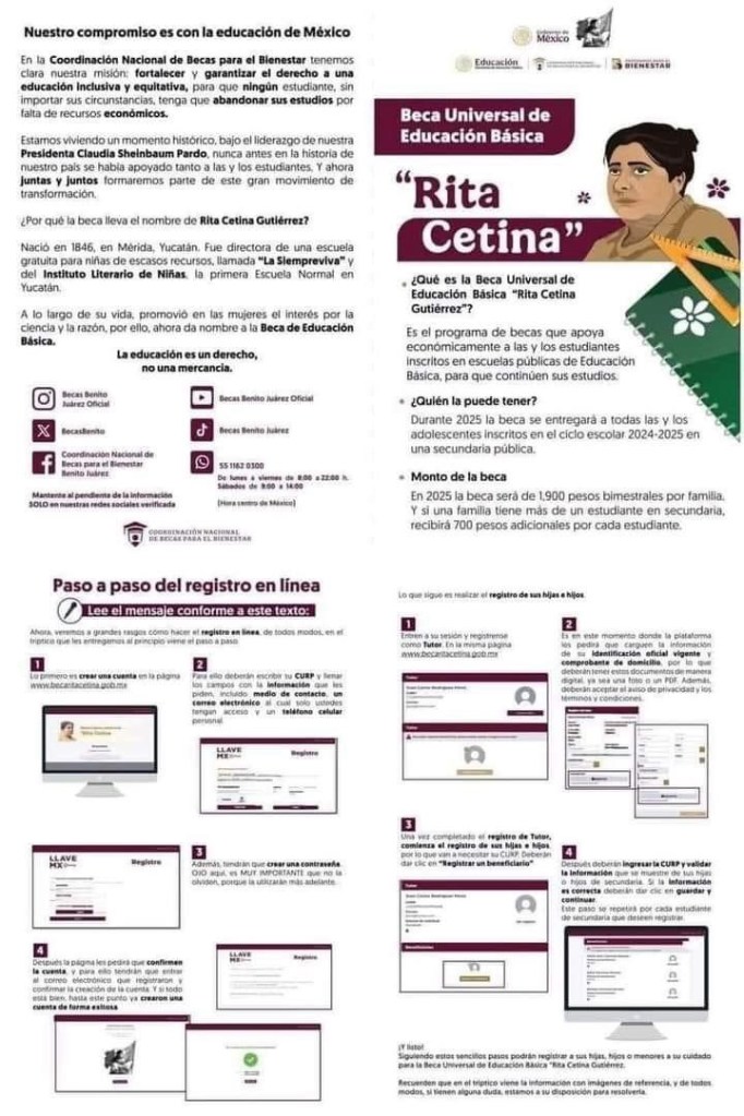 A partir de hoy inicia el registro para la Beca Rita Cetina, que otorga mil 900 pesos por familia y 700 por estudiante. El registro será en línea hasta el 18 de diciembre en becaritacetina.gob.mx.
