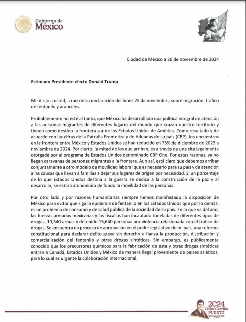 México.- La presidenta de México, Claudia Sheinbaum, respondió duramente al presidente electo de Estados Unidos, Donald Trump, ante el arancel del 25 por ciento que impondría a México a partir del 20 de enero.