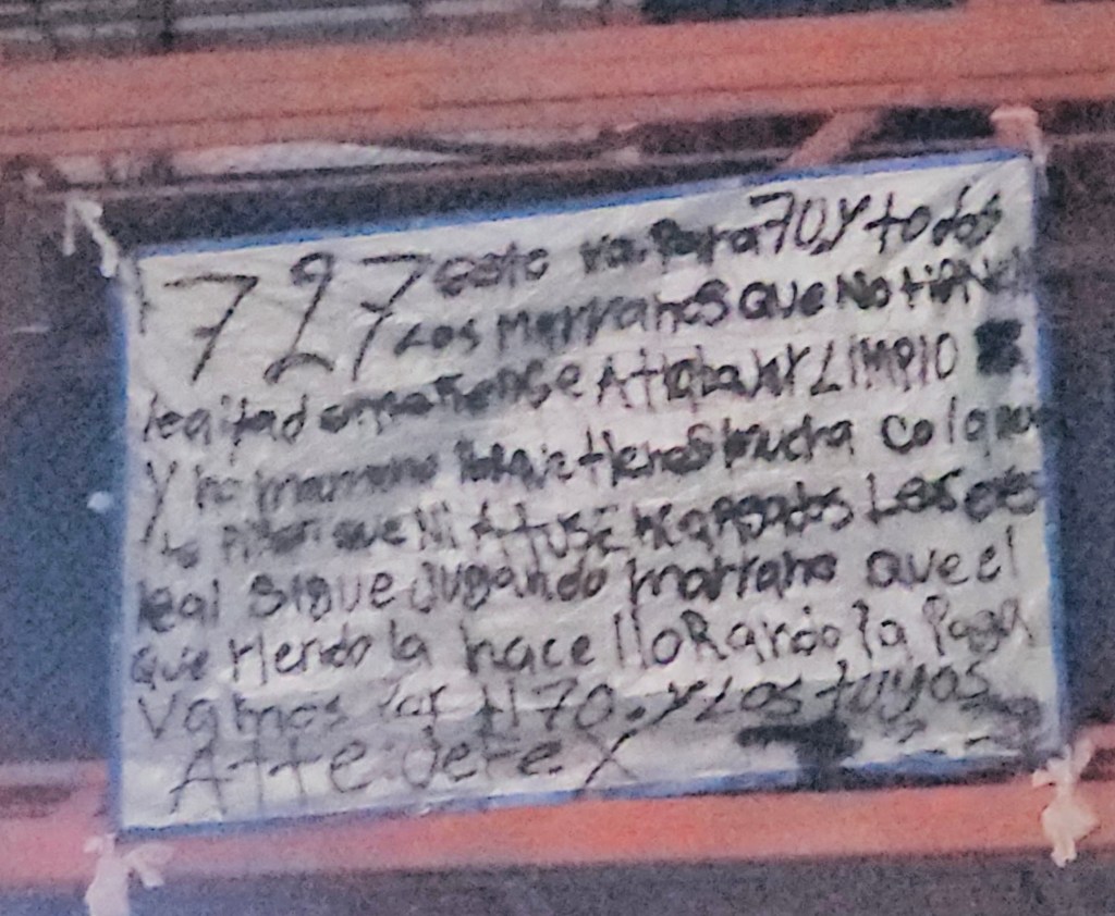 En la manta se lee: “Esto va para 70 y todos los marranos que no tienen lealtad enséñense a trabajar limpio y no marranos porque tienes mucha cola que te pisen que ni a tus encargados les eres leal sigue jugando marrano que el que riendo la hace llorando la paga vamos por ti H70 y los tuyos ATTE JEFE X”.