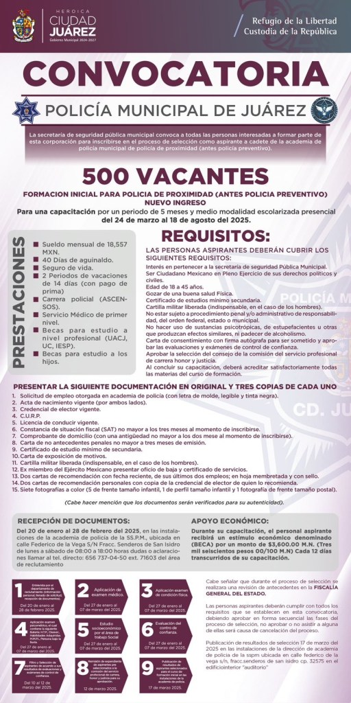Los beneficios que se ofrecen destaca un sueldo de 18 mil 557 pesos mensuales, 40 días de aguinaldo, seguro de vida, dos periodos vacacionales de 14 días por año, participación en ascensos, servicio médico de primer nivel, becas para estudio a nivel profesional y becas escolares para sus hijos.